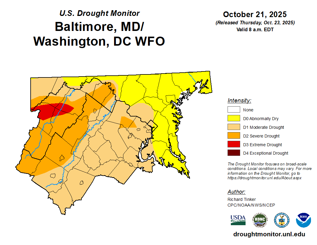 • Freeze Warning issued October 24 at 12:19PM EDT until October 25 at 9:00AM EDT by NWS Baltimore MD/Washington DC